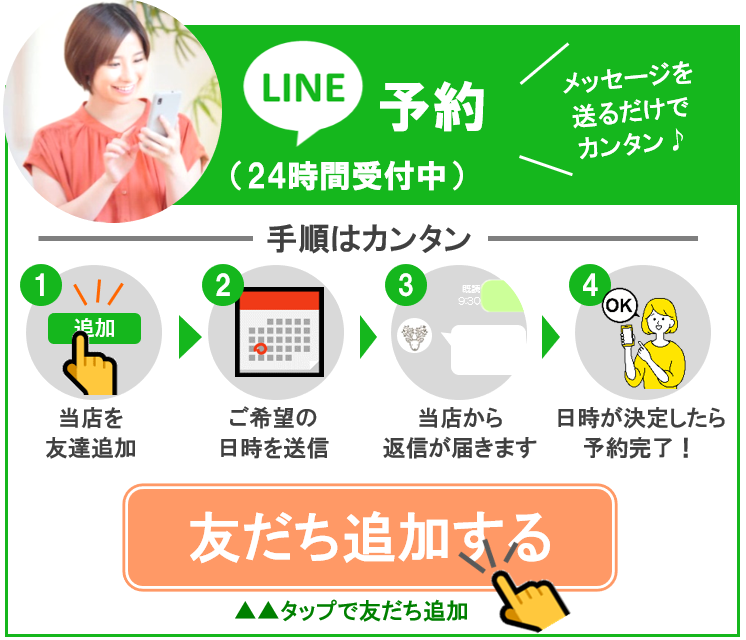 ご予約は、お店の公式LINEより24時間受け付けております。 まずは下記ボタンから当店を友だち追加し、 ご希望の日時を送ってください。